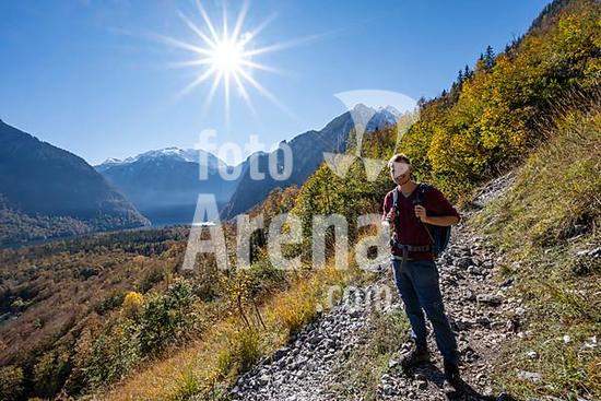 ibxmab10158725 Mountaineers on a mountain hiking trail, Rinnkendlsteig, autumn forest and snow-covered mountains, Sonnenstern, Berchtesgaden National Park, Berchtesgadener Land, Upper Bavaria, Bavaria, Germany, Europe