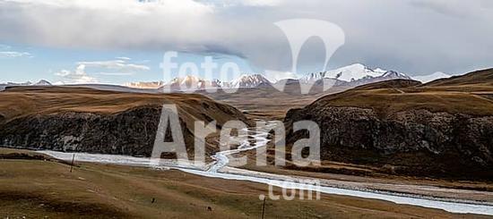 ibxmzf10515980 Mountain stream Sary Jaz, behind Glaciated and snow-covered mountains, autumnal plateau with yellow grass in the morning light, Tian Shan, Sky Mountains, Sary Jaz Valley, Kyrgyzstan, Asia