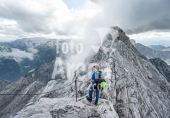 ibxmab10941662 Mountaineer on a narrow rocky ridge on a steel cable, Watzmann crossing to Watzmann Mittelspitze, view of mountain panorama, Berchtesgaden National Park, Berchtesgaden Alps, Bavaria, Germany, Europe