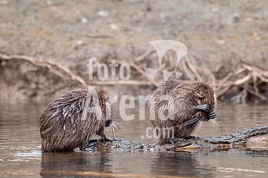 ibxmmh10358480 Two nutria (Myocastor coypus), wet, standing on a branch lying in the water, one nutria keeps its face covered with its paws, hiding, profile view, background blurred riverside vegetation, Rombergpark, Dortmund, Ruhr area, Germany, Europe