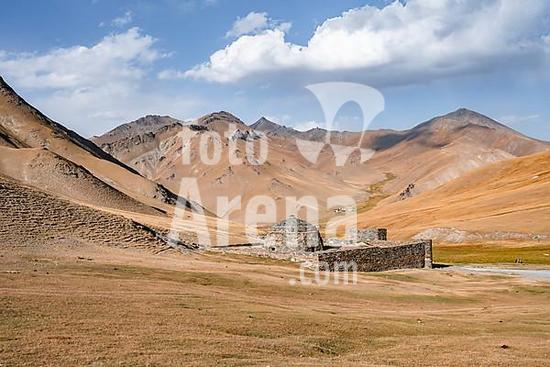 ibxmmw10049465 Historic caravanserai Tash Rabat from the 15th century, with yellow hills, Atbashy district in the Naryn region, Kyrgyzstan, Asia