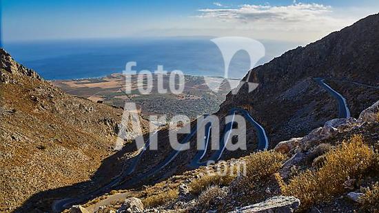 ibxraa10069418 Serpentine road winds through a dry mountainous landscape down to the sea, Kallikratis, Kallikratis Gorge, Sfakia, West Crete, Crete, Greek Islands, Greece, Europe