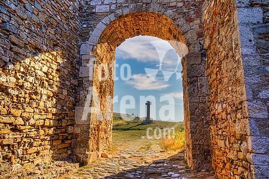 ibxraa10260299 Stone arch with view of a path and ancient column in the background, sea fortress Methoni, Peloponnese, Greece, Europe