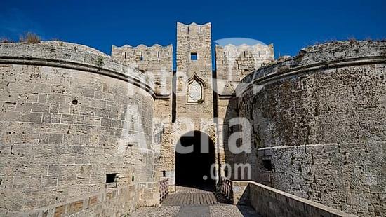 ibxraa10662086 Emery d 'Amboise Tor, city wall of Rhodes, entrance of a medieval fortress with massive stone walls and towers, under blue sky, Rhodes Old Town, Rhodes Town, Rhodes, Dodecanese, Greek Islands, Greece, Europe