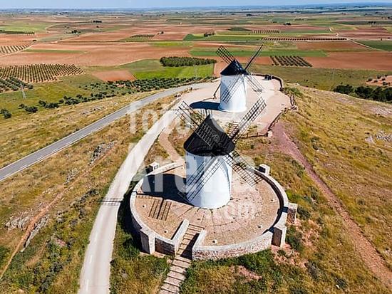 ibxsco11082296 Aerial view of two white windmills with black roofs on a hill with roads and fields, aerial view, Alcazar de San Juan, Ciudad Real, Castilla-La Mancha, Route of Don Quixote, Spain, Europe