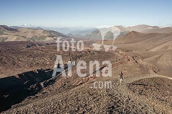 ibxsse10518248 Young woman walking through lava fields, Crater Navidad, Lonquimay volcano, Malalcahuello National Reserve, Curacautin, Araucania, Chile, South America