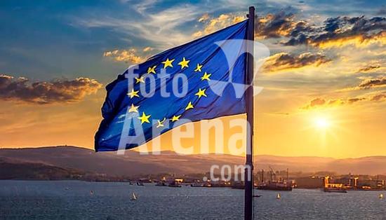 ibxsuc10479332 The flag of the EU flutters in the wind, isolated, towards sunset