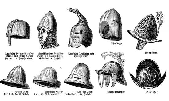 ibxsuc11091755 Helmets from various periods from the 11th century to the 18th century, illustration from 1880, historical, digital reproduction of an original from the 19th century