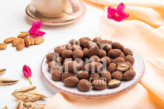 ibxuzg10141949 Almond in chocolate dragees on ceramic plate and a cup of coffee on white concrete background and orange linen textile. Side view, close up