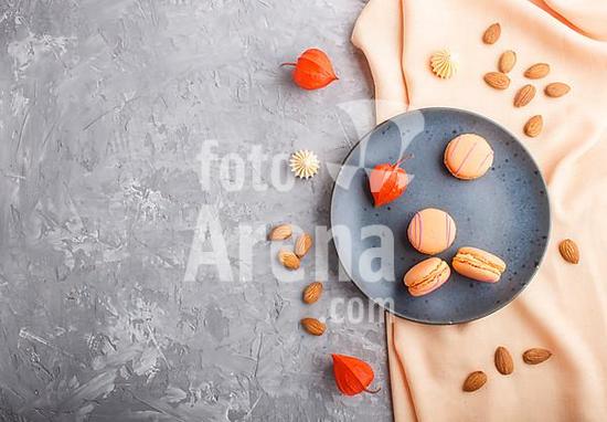 ibxuzg10174835 Orange macarons or macaroons cakes on blue ceramic plate on a gray concrete background and orange textile. Flat lay, top view, copy space