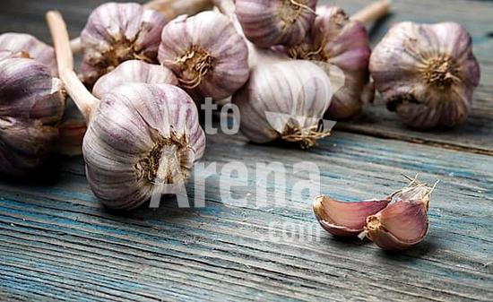 ibxuzg10194419 Fresh violet garlic on a blue rustic wooden background with copy space