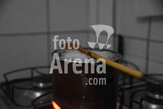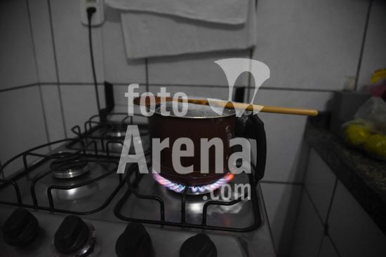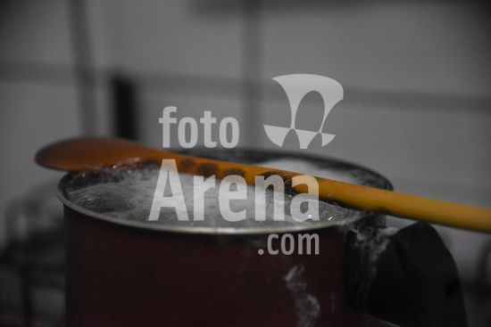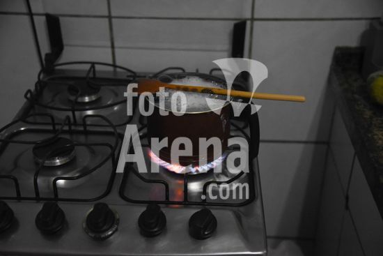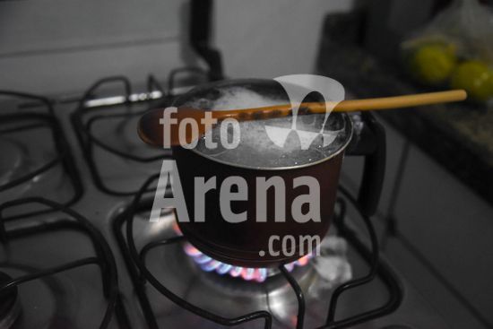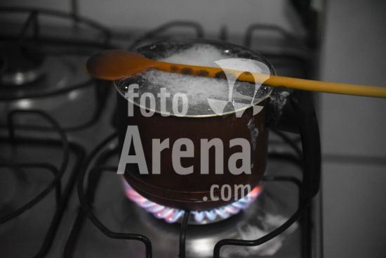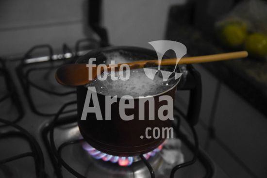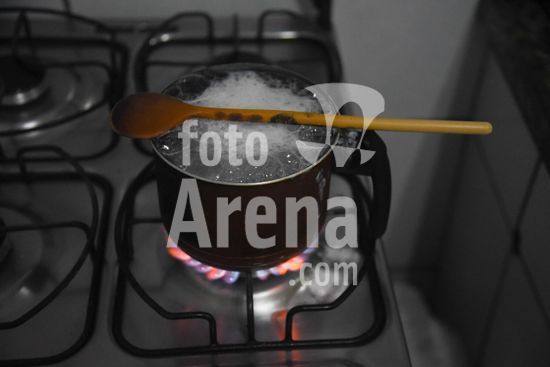 2816324 Panela com água fervendo e uma colher de pau para evitar que haja transbordamento no fogão.