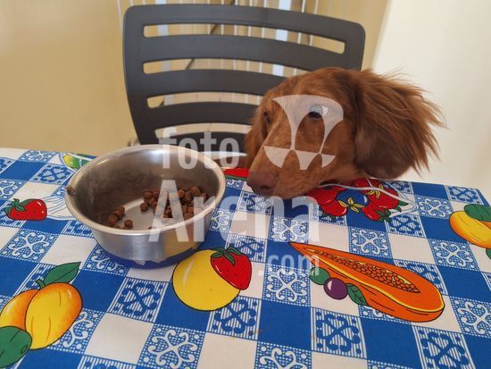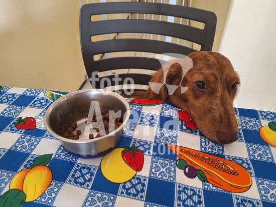 2819918 Cachorro sentado na cadeira com o seu prato de ração na mesa.