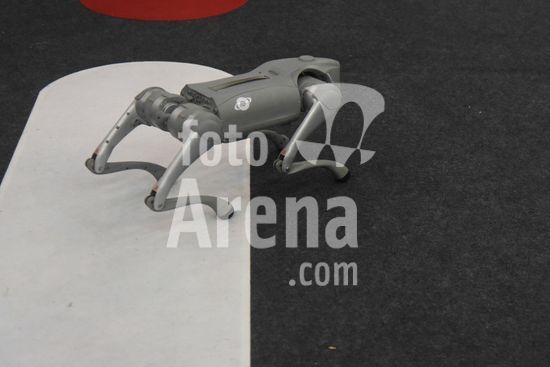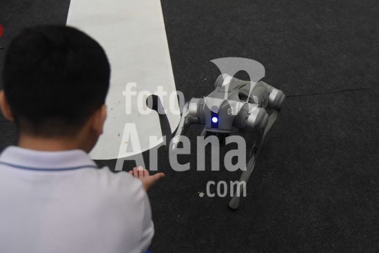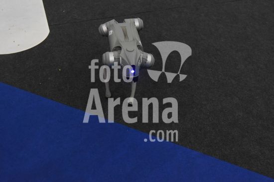 2819917 Cachorro sentado na cadeira com o seu prato de ração na mesa.