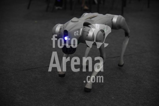 2819919 Cachorro sentado na cadeira com o seu prato de ração na mesa.