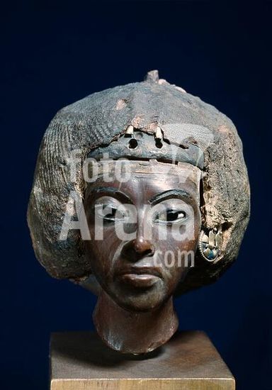 akg1397017 Teje, ägyptische Königin, Gattin Amenophis' III., Mutter Echnatons, 18. Dynastie.-Porträtkopf.-Eibenholz, Perücke aus Leinwand, Höhe 9,4 cm. Um 1370 v.Chr. Museum: SMB, Ägyptisches Museum., BERLIN.