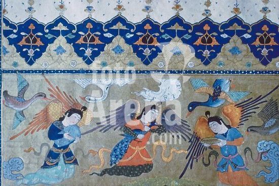 akg1573328 Firdausi; pers. Dichter; um 940-1020. Werke: Schahname (Königsbuch; Epos, 1014 vollendet). /-Engel und Vögel.-/ Ausschnitt aus einer Miniatur, persisch, 15.Jahrhundert. Gouache auf Papier. Museum: Topkapi Serail Library., ISTANBUL.