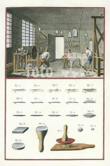 akg1329454 Optik / Optiker.-"Lunetier / Verres et differents foyers".-(Werkstatt eines Brillenmachers / Verschiedene Arten von Linsen). Kupferstich. Aus: D.Diderot u.J.B. D'Alembert, Encyclopedie ou Dictionnaire des Sciences, des Arts et des Metiers, 1751-1781. Spätere Kolorierung.