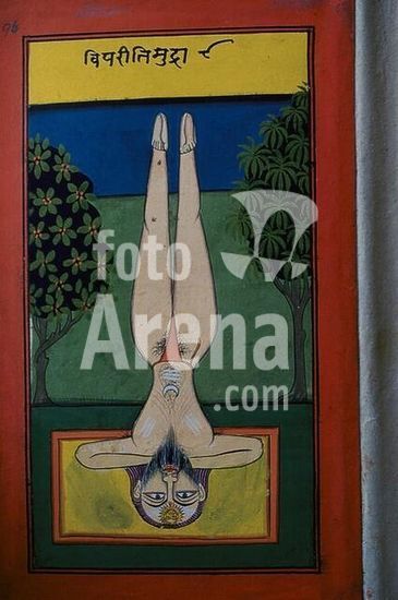akg1109742 Indian miniature, 18th/19th Century.-Yogi practicing yoga (Shoulderstand-(Sarvangasana).-/ Gouache on paper. From a series of images depicting various asanas and mudras (body positions) adopted in Hatha Yoga with verses in Hindi. Oriental and India Office Collections, Add. 24099, fol.96. Museum: British Library., LONDON.