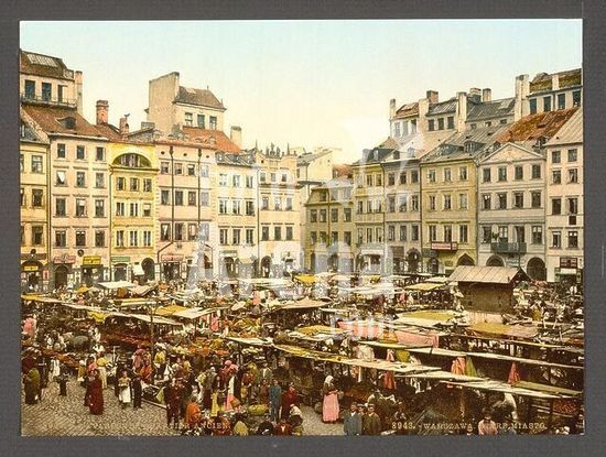 akg1134537 Warschau-Warszawa (Polen), Altstadtmarkt-Rynek Starego Miasta.-VARSOVIE. QUARTIER ANCIEN.-WARSZAWA STARE MIASTO.-Ansicht mit Markttreiben. Photochrom, um 1890/1900 ( Detroit Publishing Co.).