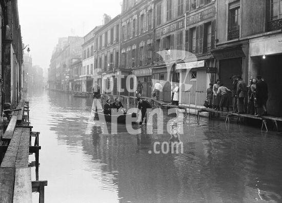 akg1575024 Hochwasser. /-Hochwasser der Seine im Januar 1955: Die überschwemmte Rue de Paris in Courbevoie (Dép. Hautsde-Seine, Frankreich): Mit Kähnen und über Stege versuchen die Bewohner ihre Häuser zu erreichen.-/ Foto, 24. Januar 1955.
