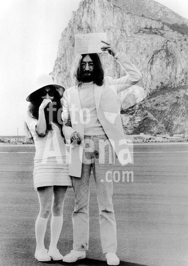 dpa7946645 Bandphoto / uppa JOHN LENNON and YOKO ONO pose for the cameras on their wedding day March 21, 1969, with John Lennon holding aloft the couple's marriage certificate at the Rock of Gibraltar.