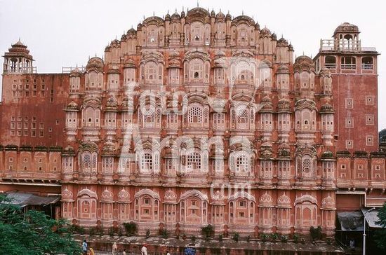 akg1517216 Jaipur (Rajasthan, Nordwest-Indien), Hawa Mahal / Palast der Winde (erbaut 1799 unter dem Maharaja Sawai Pratap Singh; Arch.: Lal Chand Usta; die 953 Fenster der OstFassade erlaubten den Damen des Harems, ohne gesehen zu werden das Treiben auf der Straße zu verfolgen). /-Ansicht der Fassade.-/ Foto, August 1977.