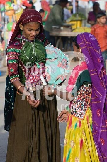 akg1150528 Völkerkunde / Indien. /-Im Dorf Dhrag bei Bhuj (Gujarat, Indien): zwei junge Frauen teilen sich ein Eis am Stiel während eines Festtages.-Foto, 24.02.2009.