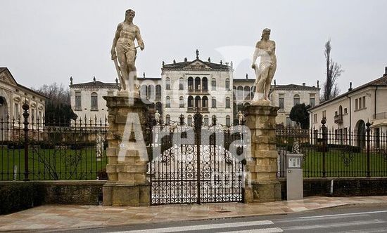 akg1101827 Asolo (Venetien, Italien), Villa Rinaldi (erbaut 16. und 17. Jh.).-Außenansicht, Straßenseite, mit schmiedeeisernem Tor und flankierendem Skulpturenschmuck.-Foto, undatiert.
