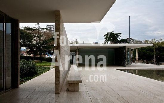 akg1102538 Barcelona (Katalonien, Spanien), Pabello Mies van der Rohe (Deutscher Pavillon der Weltausstellung 1929 in Barcelona; Arch.: Mies van der Rohe; 1986 am Ursprungsstandort rekonstruiert).-Teilansicht: Blick vom Nebenpavillon zum Hauptbau.-Foto, undatiert.