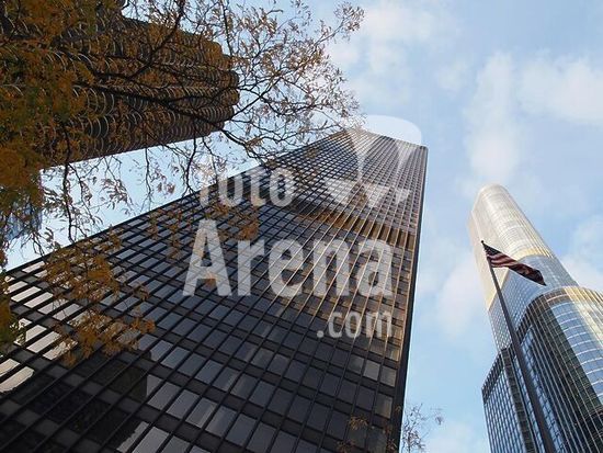 akg1947517 Chicago (Illinois, USA), 330 North Wabash / IBM Building (erbaut 1971-73; Arch.: Ludwig Mies van der Rohe).-Außenansicht (Mitte); links: ein Wohnturm der Marina City (erbaut 1959-64; Arch.: Bertrand Goldberg); rechts: Trump International Hotel and Tower (auch: Trump Tower Chicago; 401 North Wabash Ave.; erbaut 2005-09; ...