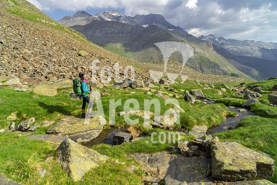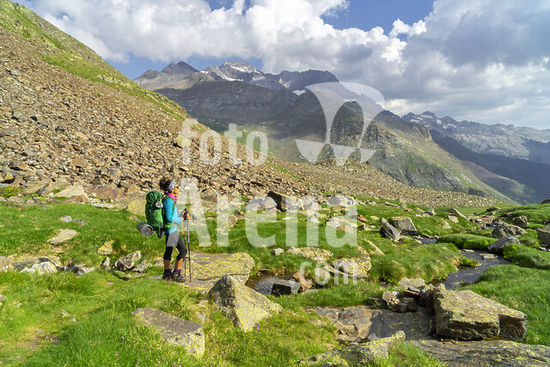 alb9580701 hiker in front of the Posets peak, 3371 meters, Valle de Añes Cruces, Posets-Maladeta natural park, Huesca, Pyrenees mountain range, Spain.