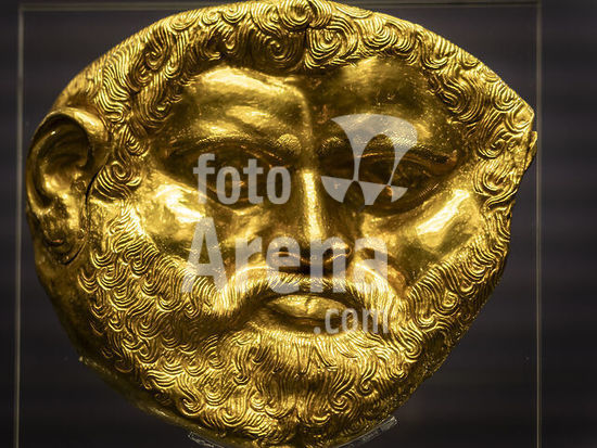 alb19453605 Thracian funerary mask of King Teres, Shipka, 5th century BC, gold,, Bulgarian National Archaeological Museum, Sofia, Republic of Bulgaria, Europe.