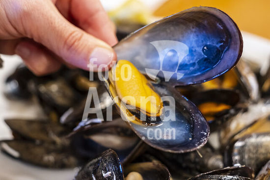 alb19453886 typical Galician steamed mussels, La Coruña, (Corunna), Galicia, spain.