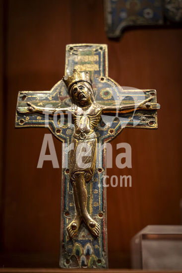 alb19453612 Crucifix, 12th century, copper and enamel, Limousin workshop, comes from the cover of a gospel, Santiago de Compostela Cathedral, Santiago de Compostela, province of La Coruña, Galicia,.