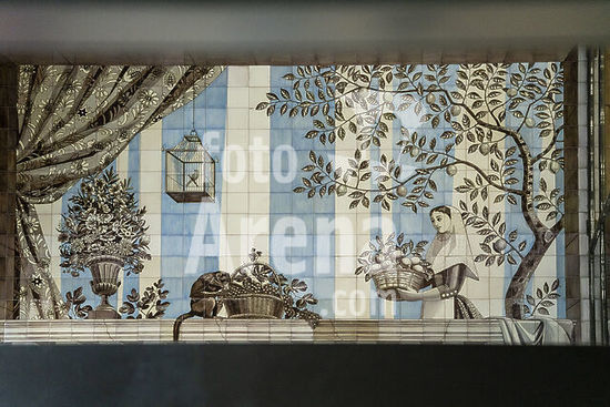 alb19453623 Ceramic tiles with a scene of a peasant woman in traditional Majorcan dress and monkeys, twentieth century, Jaume III shopping galleries, Palma, Mallorca, Balearic Islands, Spain.