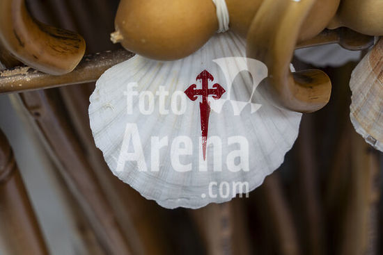 alb19453918 Santiago walking sticks and shells in a souvenir shop, Galicia, province of La Coruña, Santiago de Compostela.