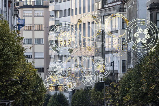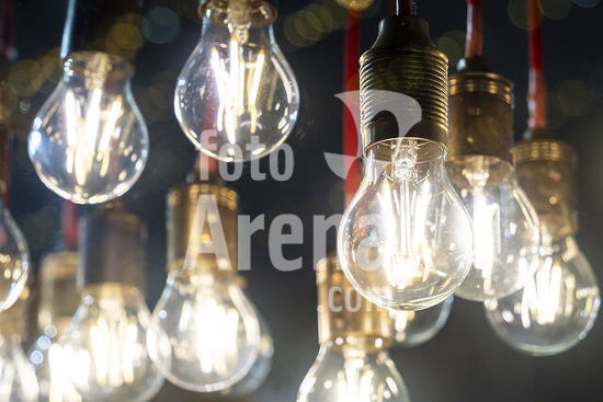 alb19453934 light bulbs lit in a shop window, Santiago de Compostela, province of La Coruña, Galicia,.