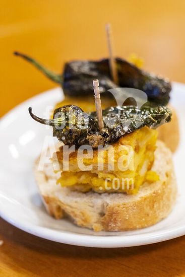 alb19453936 Potato omelette tapa with Padrón pepper, La Coruña, (Corunna), Galicia, spain.
