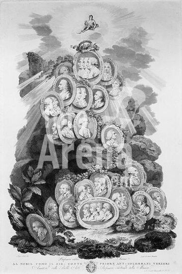 Portrait de professeurs de musique, de musicologues et de compositeurs. "Professori celebri di Suono". (Le Parnasse, Apollon et médaillons à l'effigie de : G.F.Somis, Pietro Locatelli, Francesco Geminiani, Adélaïde-Suzanne Krumpholtz, entre autres). Gravure sur cuivre, de Pietro Bettelini (1763-1829), d'ap. dessin de Luigi Scotti. Berlin, Sammlung Archiv für Kunst und Geschichte. Museum: Berlin, Sammlung Archiv für Kunst und Geschichte.
