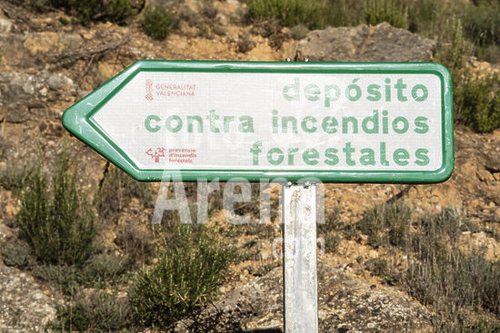 alb19348287 sign indicating a water tank for forest fire prevention, Sanctuary of the Virgin of Balma, Zorita del Maestrazgo, province of Castellón, Valencian Community, Spain.