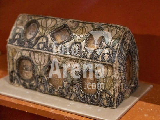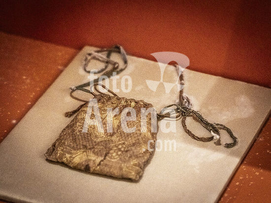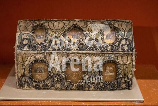 alb19453911 13th-century relic bag, Hispano-Moorish fabric, cathedral of Our Lady of Saint-Bertrand de Comminges, Haute-Garonne, Midi-Pyrénées region, France.