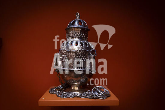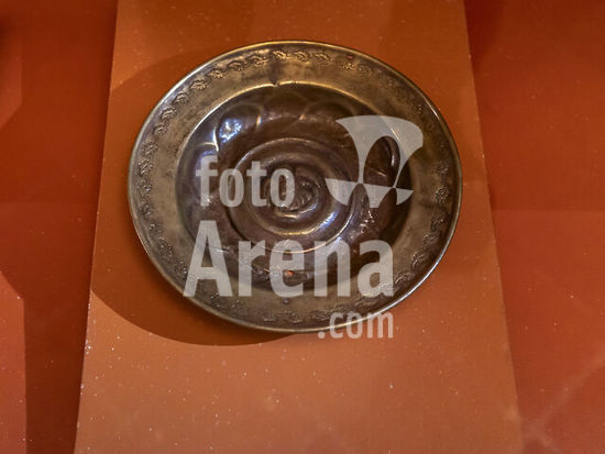 alb19453823 quest dish, 16th century gilded brass, cathedral of Our Lady of Saint-Bertrand de Comminges, Haute-Garonne, Midi-Pyrénées region, France.