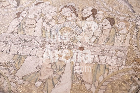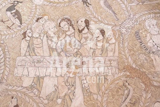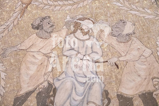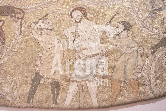 alb19453916 scene from the Passion of Christ, Passion cloak of Saint Bertrand of Comminges, 14th century, embroidered fabric, cathedral of Our Lady , Haute-Garonne,France.