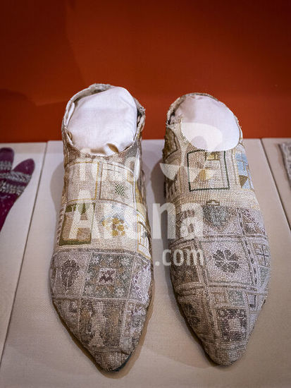 alb19453907 fourteenth century liturgical sandals, white silk net embroidered with colored silks, cathedral of Our Lady of Saint-Bertrand de Comminges, Haute-Garonne, Midi-Pyrénées region, France.