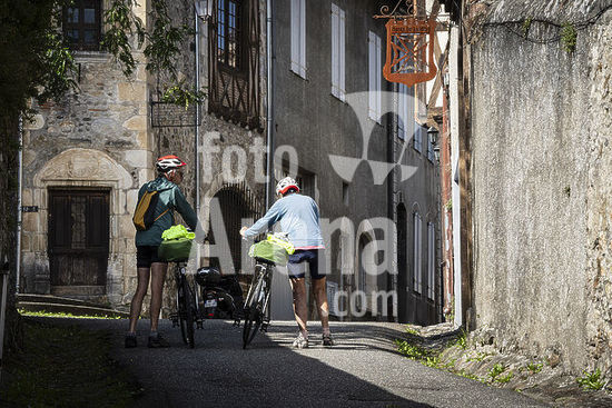 alb19453912 senior citizens cycling tourists on the street, Saint-Bertrand-de-Comminges, Haute-Garonne, Midi-Pyrénées region, France.