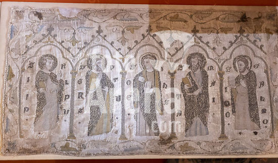 alb19453917 Fragment of embroidery with 5 apostles, 14th century, embroidered satin, cathedral of Our Lady of Saint-Bertrand de Comminges, Haute-Garonne, Midi-Pyrénées region, France.