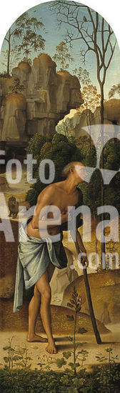 alb3708946 The Crucifixion with the Virgin, Saint John, Saint Jerome, and Saint Mary Magdalene [left panel]. Dated: c. 1482/1485. Dimensions: left panel: 95 x 30.1 cm (37 3/8 x 11 7/8 in.) framed: 134 x 165.1 x 7.3 cm (52 3/4 x 65 x 2 7/8 in.). Medium: oil on panel transferred to canvas. Museum: National Gallery of Art, Washington DC. Author: PIETRO PERUGINO.