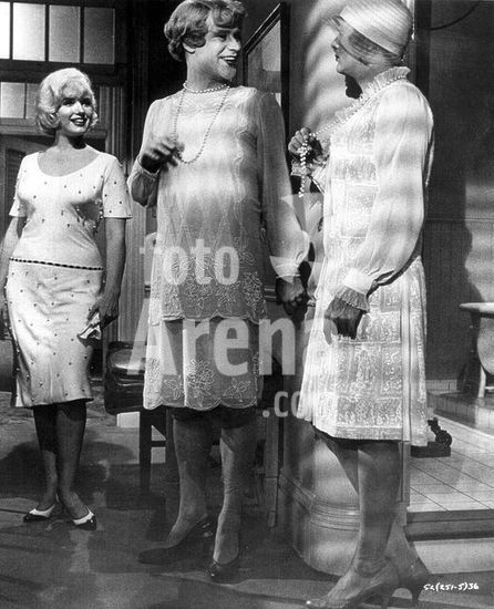 dpa7349680 (dpa) - A movie scene from Billy Wilder's classical film comedy 'Some Like It Hot' (1959). The musicians Jerry (Jack Lemmon, C) and Joe (Tony Curtis, R), dressed as women, with their colleague Sugar Kane (Marilyn Monroe, L). Billy Wilder died on 28 March 2002 at the age of 95 in his home in Beverly Hills. After starting his career in Berlin he emigrated to the United States in 1933 and went down in film history with movies like 'Some Like It Hot', 'Sunset Boulevard' and 'The Apartment'.