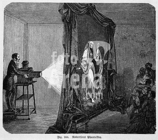 akg033381 Optik / Laterna Magica. "Robertsons Phantaskop". (Theatralische Vorstellung von Geistererscheinungen, um 1840). Holzstich. Aus: F.Reuleaux (Hrsg.), Das Buch der Erfindungen, Gewerbe und Industrien, Bd. 2., 8. Aufl. Leipzig u. Berlin 1885.